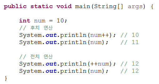 num이라는 변수에 10 이라는 값이 저장되어있다. 출력을 해보았을때 num++는 후치연산으로써 저 코드가 마무리 되고나서 +1 이 되는것이다. 그래서 그 다음줄 num 을 출력해 보았을때 10이 아닌 11로 +1이 된것을 알수 있다.